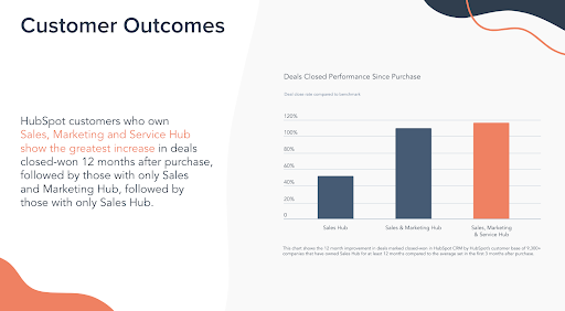 Take a look at these “deals closed” numbers showing that the use of three coordinated HubSpot hubs (Sales, Marketing, Service) perform better than two (Sales, Marketing), which are better than just a single (Sales) hub …
